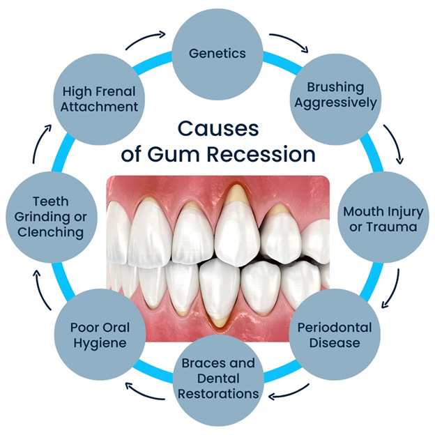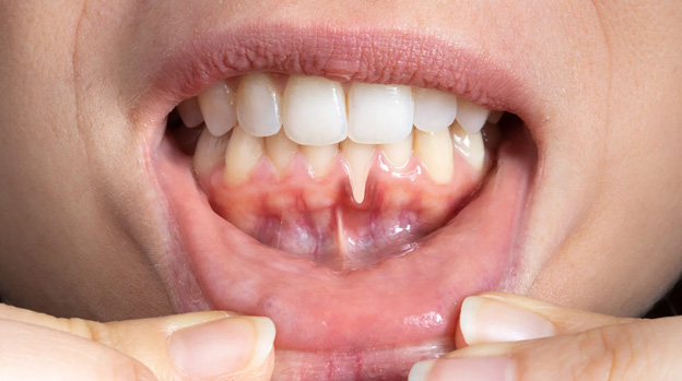 Gum recession denotes gum disease where the gum tissue withdraws from the teeth, uncovering the roots beneath. It increases the susceptibility of teeth to cavities and can lead to heightened tooth sensitivity during brushing and eating. One or multiple teeth may be involved. While gum recession can impact individuals of all age groups, it is more common in people over 65.